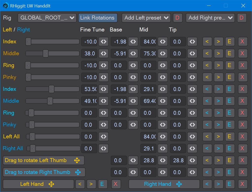 Hand-it (ハンドイット)は、キャラクターの手や指の表現に特化したアニメーションシステムです。 LightWave 2024で搭載されたリギングシステム「Rhiggit(リギット)」をさらに補完・強化する目的で開発されました。 直感的な操作性と高精度なコントロールを両立しており、誰でも簡単に、キャラクターに繊細で自然な手の演技を加えることができます。
