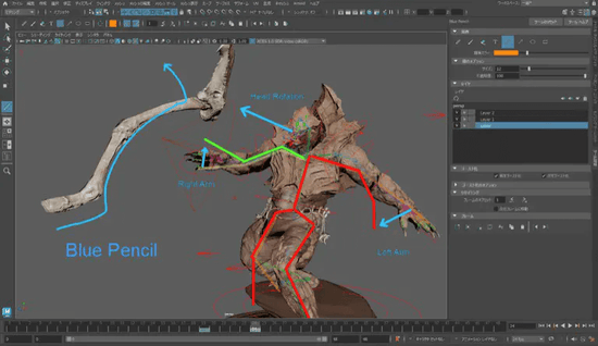 MayaのBluePencilツールセットを使用すると、アーティストは2Dスケッチをビューポートに直接、シーン上にクリーンで非破壊的な方法で描くことができます。アーティストは、時間の経過とともにポーズをスケッチしたり、モーションを定義したり、ショットをマークアップしたり、注釈やコメントを追加してアニメーションワークフローに活用できます。