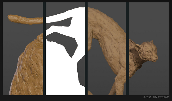 このワークフローの強みは、モデルのベースメッシュが確定する前であっても、フォトリアルな色とディテールを塗り、彫り込むことができる点です。