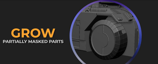 全て拡張と全体縮小のマスキング機能は、モデルのサーフェイスにマスクを適用するプロセスにおいて、より洗練されたコントロールを提供します。全て拡張機能は、マスクの一部が隣接する面に接触している場合に、現在選択されているマスクの部分を拡大し、ジオメトリ的なシェルの端で終了することにより、アセットのサーフェイス上のマスキングを拡大します。全体縮小は、マスクが解決されジオメトリ シェルの端に合うポイントで終了するように動作しながら、マスクのサイズを縮小します。